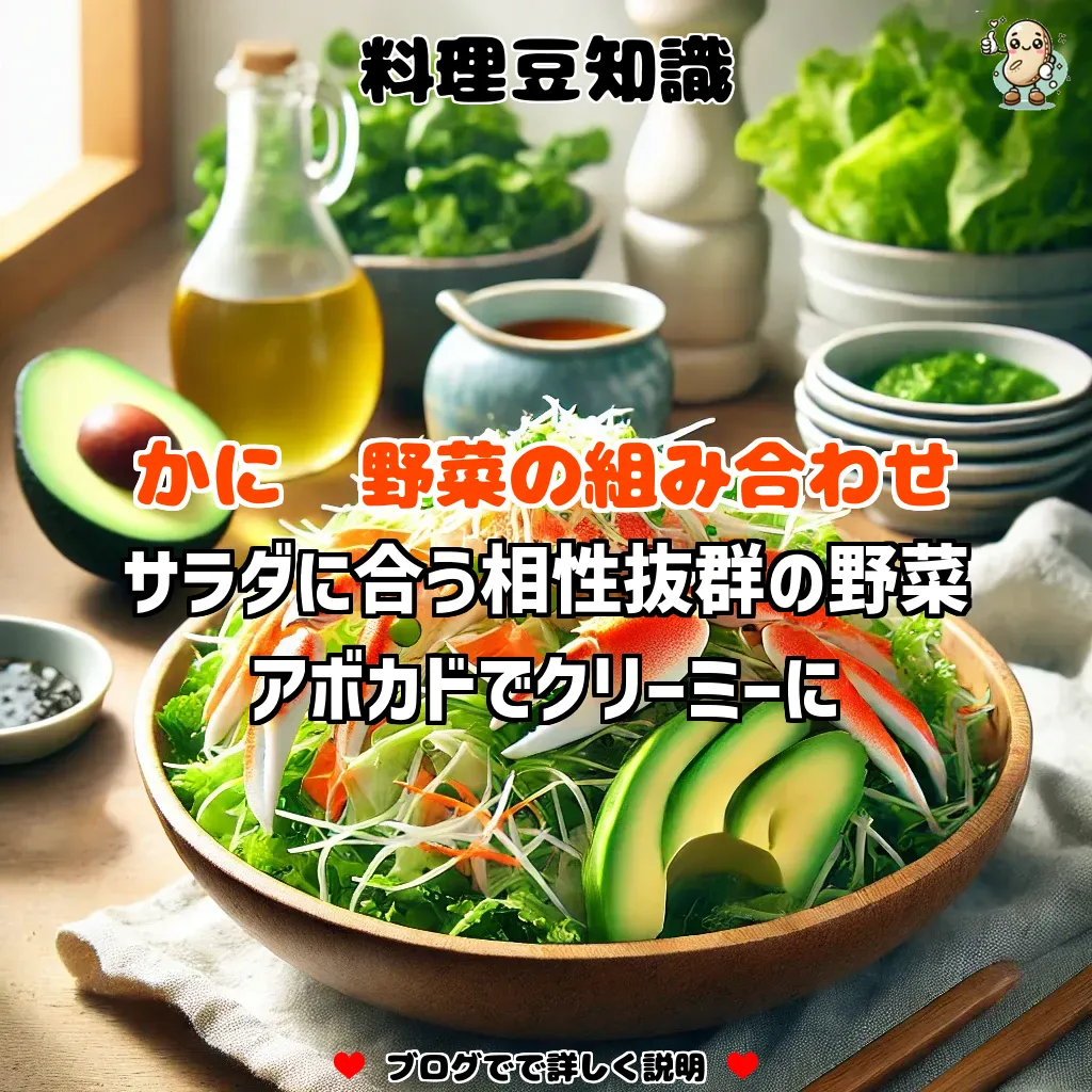 アボカドがかにサラダに最適な理由は、そのクリーミーな食感とまろやかな風味が、かにの淡泊な旨味と絶妙に調和するからです。かにの柔らかい身は、アボカドのなめらかさと組み合わさることで、互いの風味を引き立て合い、よりリッチな味わいを生み出します。特にアボカドには健康的な脂肪分が含まれており、これがかにの旨味を包み込み、味の深みを増す効果があります。脂肪分は旨味を引き立てる役割も果たし、かにと合わせることで、クリーミーさが増しつつも、かにの風味が主役として引き立ちます。また、アボカドはマイルドでクセが少ないため、他の食材とも相性が良く、サラダ全体のバランスを整える役割も持っています。アボカドを加えることでサラダに濃厚さが増し、食べ応えもアップするため、満足感が得られやすいでしょう。さらに、アボカドの淡いグリーンは、かにの赤と相性が良く、視覚的にも美しいサラダに仕上がります。このようにアボカドは、味わい、見た目、食感のバランスを整えるため、かにサラダの具材として理想的です。