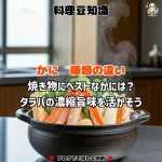 アク取りの基本は、味や見た目を良くするための大切な工程です。アクは、食材が加熱されるときに浮き出るタンパク質や脂肪の不純物が主成分で、放っておくとスープが濁り、味にも雑味が出てしまいます。アクを取る際は、鍋の温度が重要です。高温で煮立たせるとアクが細かく分散し、取り除きにくくなります。中火以下で加熱することで、アクが表面に集まりやすくなり、すくいやすくなるのです。また、アクは最初に多く出るため、かにを加えた直後からこまめにすくい取りましょう。鍋全体に広がらないよう、アクが浮いてきたらすぐに取るのが理想的です。適切なタイミングでアクを取ることで、スープが澄み、かにの旨味が引き立ち、風味豊かなかに鍋に仕上がります。こうした知識を理解することで、初心者でもより美味しいかに鍋を作ることができます。