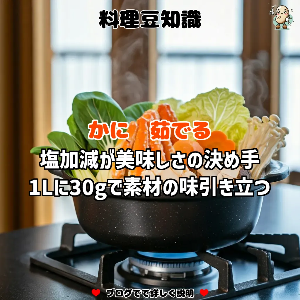 かにを美味しく茹でるためには、塩加減と火加減が重要です。基本の塩加減は、水1リットルに対して大さじ2杯で、塩が溶けてからかにを入れることで味が均等に行き渡ります。茹でる際は中火から強火で茹で、殻が赤くなるのを目安にしてください。シンプルな塩加減の調整でかにの旨味が引き立ちます。