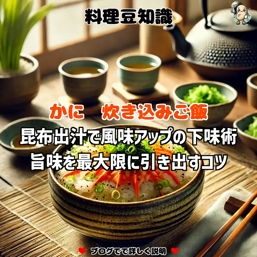 かにの炊き込みご飯を美味しく仕上げるためには、昆布を使った下味の工夫が効果的です。昆布の旨味成分であるグルタミン酸が、かにの風味を引き立て、豊かな味わいを生み出します。