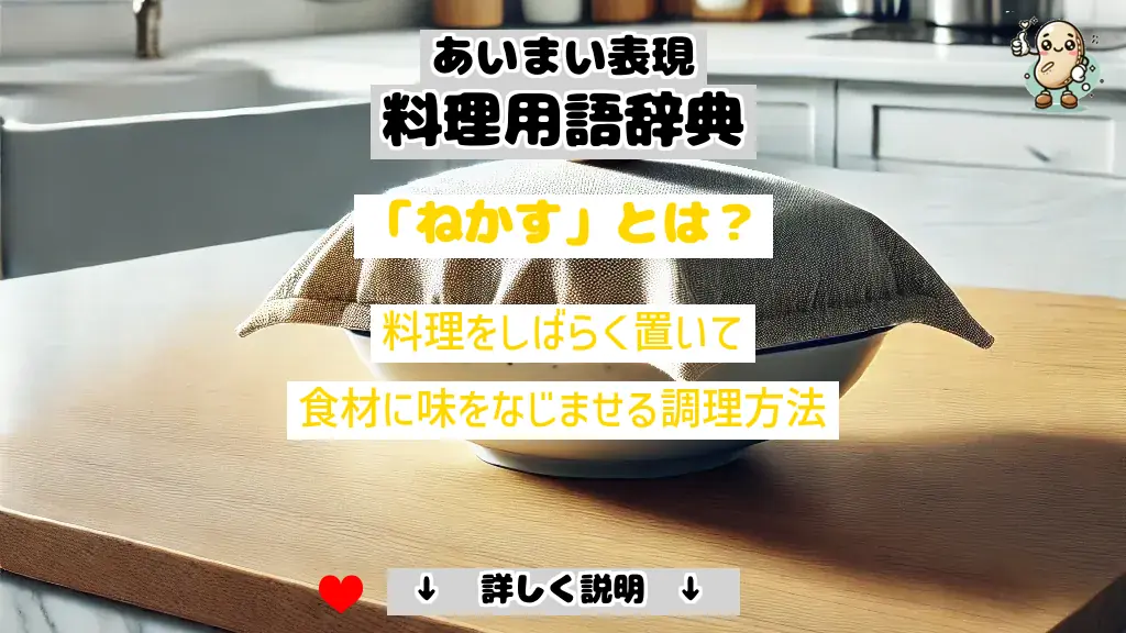 「ねかす」とは、料理をしばらく置いて食材に味をなじませる調理方法です。この過程により、食材が調味料をしっかり吸収し、風味が一層深まります。たとえば、カレーやシチューなどの煮込み料理は、作りたてよりも一晩寝かせると味が落ち着きます。その結果、よりまろやかで奥深い味わいになります。また、パンやクッキーなどの生地を寝かせることで、食感が柔らかくなり、風味が増すこともあります。たとえば、パン生地は一晩寝かせると発酵が進み、よりふんわりとした仕上がりになります。クッキー生地は少なくとも1時間から数時間寝かせることで、扱いやすくなり、焼き上がりも均一になります。