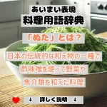 「ひたす」とは、食材を液体に浸して味をしみこませる調理法です。たとえば、漬物や和え物など、風味をしっかりと加えたい料理でよく使われます。だしやしょうゆ、酢などを使って、野菜や魚などに風味を加えます。液体に浸すことで、食材が柔らかくなり、味が均等にしみわたるのが特徴です。たとえば、肉をタレに浸すことで柔らかくし、風味を付けることができます。
