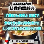 差し水とは、調理中に水を加えて、温度や火の通りを調整し、食材が均等に火が通るようにするための技法のことです。水を足すことで温度調整や火の通り方をコントロールでき、特に麺を茹でる際や煮物での水分の補充によく使われる方法です。麺を茹でて泡が出すぎた場合、差し水をすると泡が落ち着き、麺が均等に茹で上がります。煮物の場合、煮詰まりすぎて水分が減った際に差し水をすることで、食材が均等に柔らかくなるよう調整することができます。