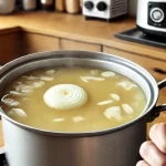 鍋に水と必要な調味料(醤油、みりん、だしなど)を入れ、中火で加熱します。調味料は最初にしっかり混ぜて、味が均一になるようにしてください。例えば、水500mlに対して醤油大さじ3、みりん大さじ2、だし小さじ1程度が目安です。このように具体的な分量を守ると、味にブレが出ず、安定して美味しく仕上げることができます。 - 切り込みを入れた玉ねぎを加え、弱火でじっくりと煮込む