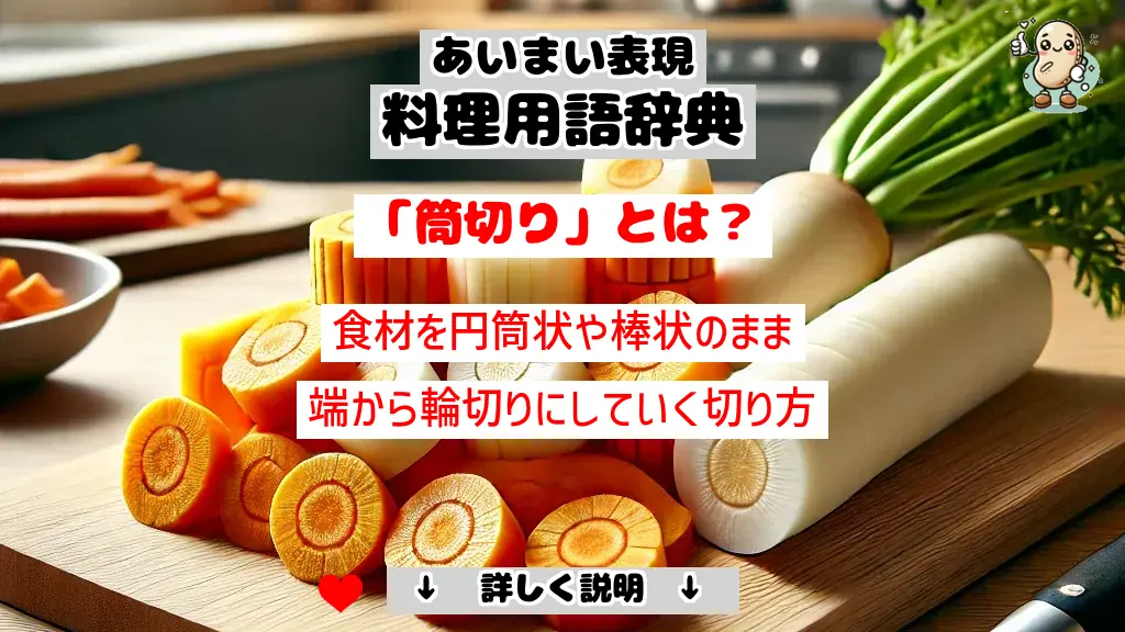 野菜では5〜10mm程度の厚さに切ることが多く、魚は数センチの厚みで切るのが一般的です。筒状のまま切ることで、食材の形が崩れにくくなり、特に煮物や焼き物で使われます。筒切りは短時間で均一に火を通すための基本的な切り方で、初心者でも簡単に実践でき、家庭料理からプロの料理まで幅広く活用できます。見た目も美しく仕上げられるため、とても人気のある技法です。
