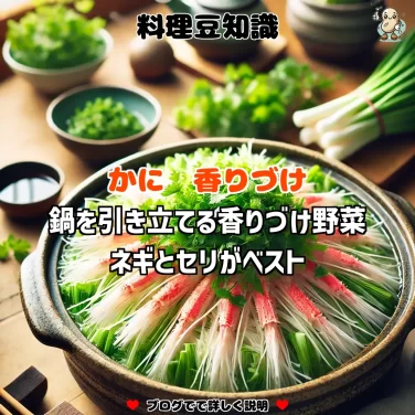 かに鍋の香りを引き立てるために、ネギやセリなど香り豊かな野菜を加えると、かにの旨味が一層引き立ちます。香りを活かした具材選びで風味豊かな鍋料理を楽しみましょう。