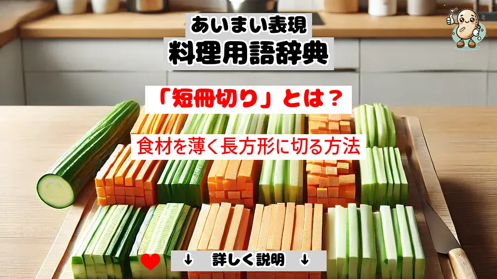 「短冊切り」とは、食材を薄く長方形に切る方法です。大根やにんじんなどに使われ、均等に火が通りやすく、見た目も美しく仕上がります。調理時間を短縮し、味を均一に染み込ませるための基本的な切り方です。