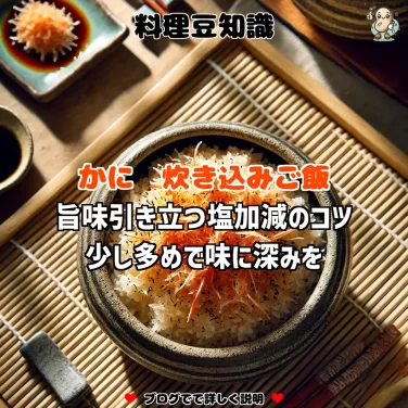 かに炊き込みご飯の塩加減で、旨味が際立つポイントをご紹介。少し多めの塩加減にすることで、かにの風味がご飯に染み込み、より豊かな味わいを楽しめます。シンプルな調味料で、かにの旨味を最大限に引き出す炊き込みご飯をぜひお試しください。