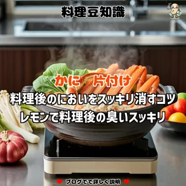 かに料理後のにおいを手軽に消すには、レモンやお酢を使った消臭法がおすすめ。鍋で煮立てて自然な香りを広げ、酸性成分がにおいを中和。家庭でも安心して使える方法で、キッチンを爽やかに保てます。